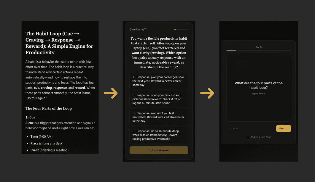 Learning mode keeps the useful details close to the topic. Quiz progress can be resumed, and highlighted insights can be easily revisited. The point is not just to generate a study plan. It is to transform the way that we learn using AI.